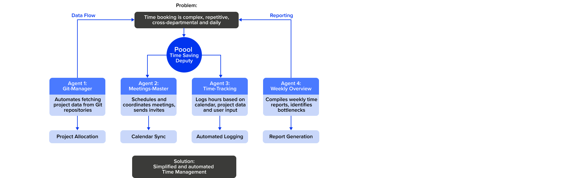 - Time-Tracking-Agent: Wandelt unstrukturierte Eingaben in Buchungen um.