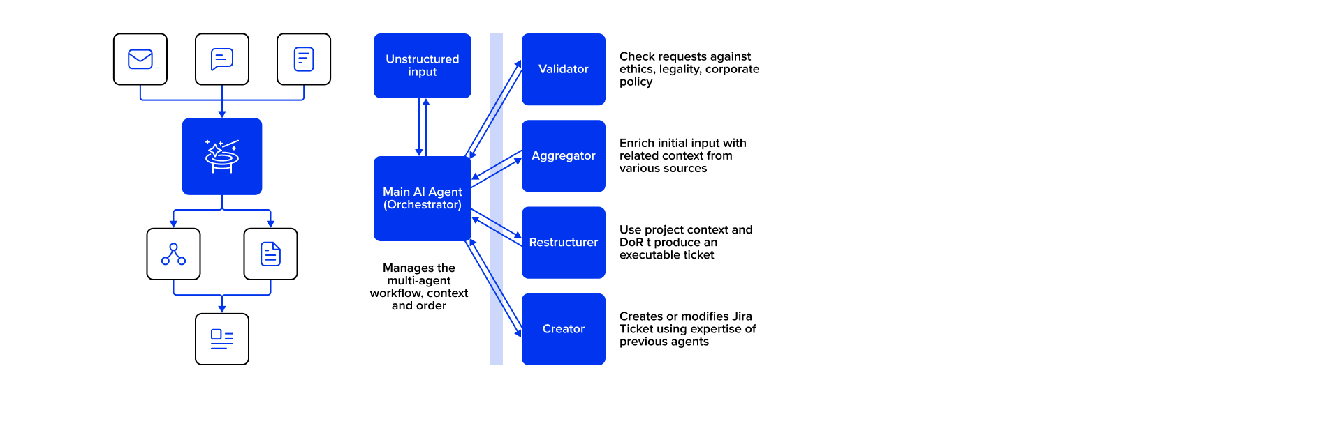 Der Orchestrator-Agent koordiniert die Pipeline und stellt sicher, dass am Ende ein einsatzbereites, DoR-konformes Ticket mit Titel, Beschreibung, Priorität, Tags und Links entsteht.