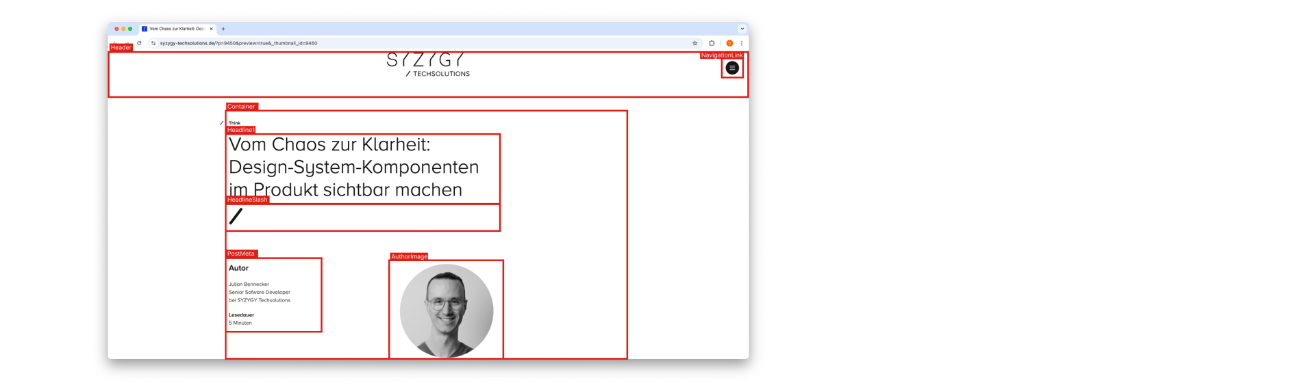 Die Extension hebt alle Design-System-Komponenten mit einem roten Rahmen hervor und blendet den Namen der jeweiligen Komponente direkt am Element ein. So erkennt man auf einen Blick, welche UI-Bausteine aus dem zentralen System stammen – und wo individuelle Lösungen im Einsatz sind.